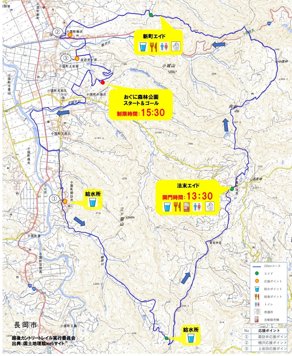 22kmコースは、最低標高70m(渋海川沿い)、最高標高348m(小国峠)。
