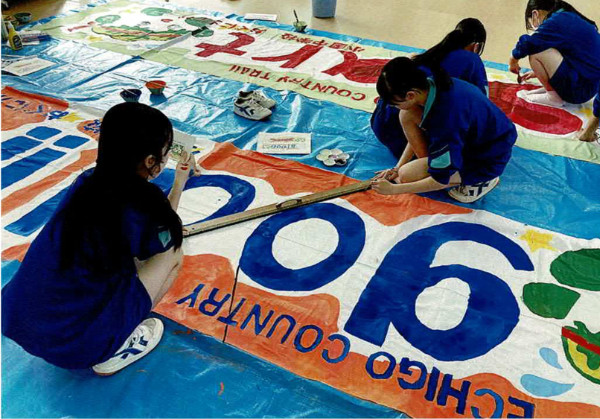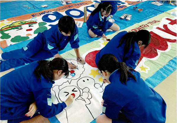 スタート・ゴール会場や、コースのあちこちで目にする横断幕。あれを作ってくれているのが小国中学校の生徒さんたちです。新学期を迎えてから6月の大会までのわずか2か月の間、勉強と部活で忙しい合間を縫って一生懸命作ってれているのです。
