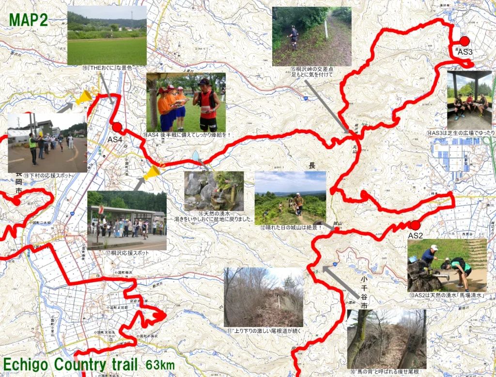 そして、この先、尾根筋を走る → AS2(小千谷市)へ下る → 再び尾根へ戻る → AS3(小千谷市)へ下る → そしてまた尾根に戻りおぐに町へ下る、という地味に脚にこたえる区間が続きます。