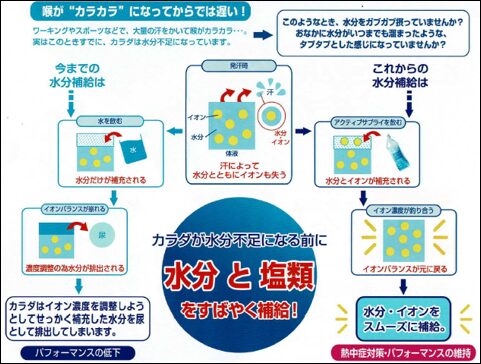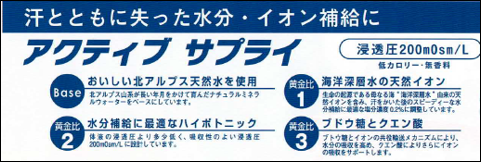 「アクティブサプライ」は、水分吸収のバランスを考えて設計されたスポーツドリンクです。海洋深層水由来のミネラルを含み、レース中でも体にスッと入りやすいのが特徴です。